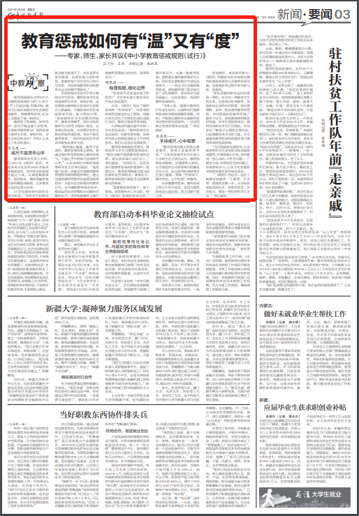 “原來教師對學生犯錯后的批評、教育非常棘手,現(xiàn)在學校和教師可以利用《規(guī)則》規(guī)定,從客觀實際出發(fā),對犯錯學生作出相應的批評或懲戒,有利于強化教育效果?!鄙钲谑宣}田區(qū)外國語學校校長謝學寧說。