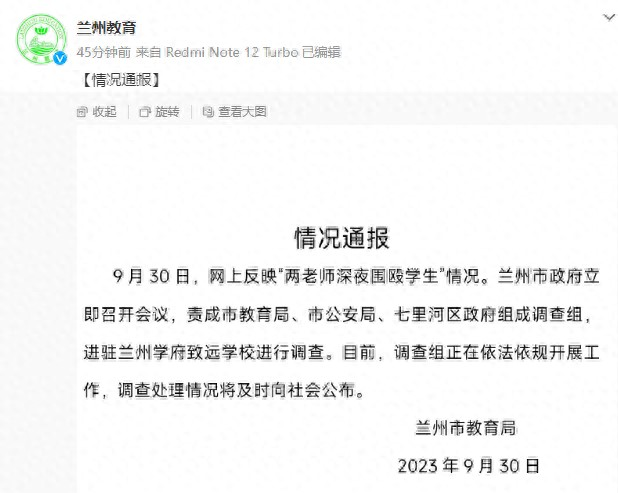 最新的消息是,針對網(wǎng)上反映“兩老師深夜圍毆學(xué)生”情況,蘭州市政府立即召開會議,責(zé)成市教育局、市公安局、七里河區(qū)政府組成調(diào)查組進(jìn)駐蘭州學(xué)府致遠(yuǎn)學(xué)校進(jìn)行調(diào)查。目前,調(diào)查組正在依法依規(guī)開展工作,調(diào)查處理情況將及時(shí)向社會公布。