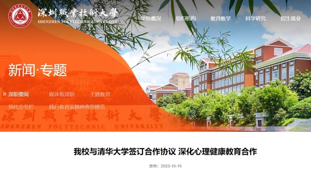 深圳職業(yè)技術(shù)大學(xué)官網(wǎng)發(fā)布消息,近日,深圳職業(yè)技術(shù)大學(xué)與清華大學(xué)合作簽約儀式在深職大舉行。依托雙方共建的深職大積極心理學(xué)研究中心,雙方將在心理健康教育方面開展深入合作,進(jìn)一步推動積極心理學(xué)在中國的發(fā)展和應(yīng)用。