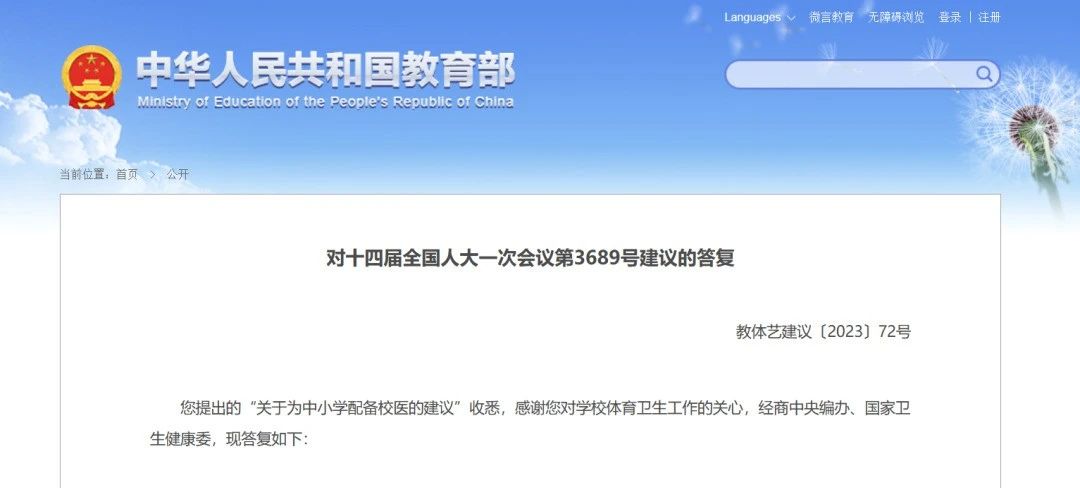 近日,教育部在答復(fù)十四屆全國(guó)人大一次會(huì)議第3689號(hào)建議,即“關(guān)于為中小學(xué)配備校醫(yī)的建議”。