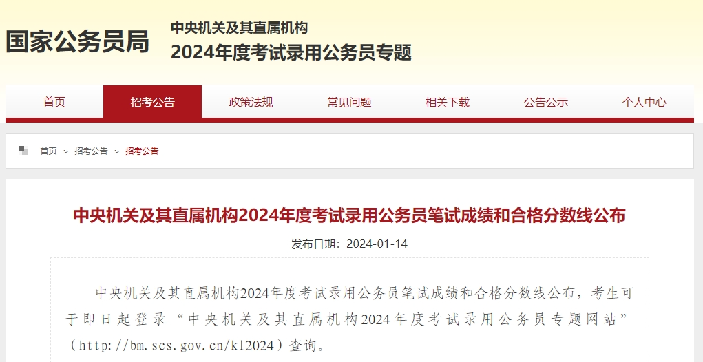 1月14日,中央機(jī)關(guān)及其直屬機(jī)構(gòu)2024年度考試錄用公務(wù)員筆試成績和合格分?jǐn)?shù)線公布,其中——