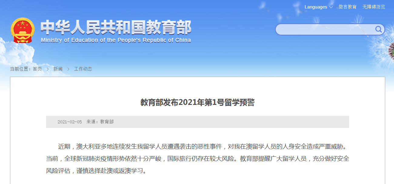 教育部提醒廣大留學(xué)人員,充分做好安全風(fēng)險(xiǎn)評(píng)估,謹(jǐn)慎選擇赴澳或返澳學(xué)習(xí)。