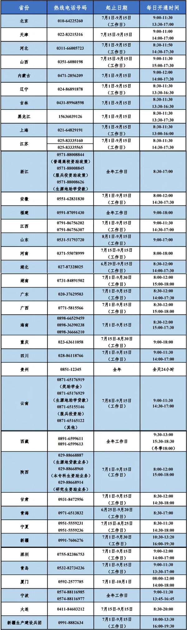2024年暑期各?。ㄗ灾螀^(qū)、直轄市)高校學(xué)生資助熱線電話開通情況匯總表