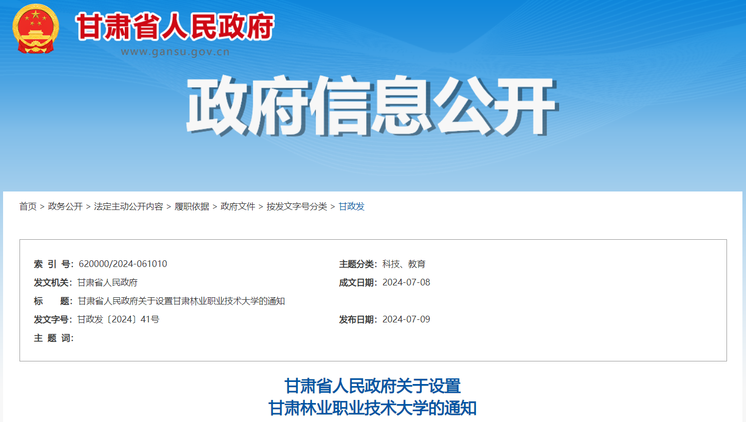 7月23日,甘肅省人民政府官網(wǎng)發(fā)布《甘肅省人民政府關(guān)于設(shè)置甘肅林業(yè)職業(yè)技術(shù)大學(xué)的通知》,省政府決定,即日起在甘肅林業(yè)職業(yè)技術(shù)學(xué)院的基礎(chǔ)上設(shè)置甘肅林業(yè)職業(yè)技術(shù)大學(xué),同時(shí)撤銷甘肅林業(yè)職業(yè)技術(shù)學(xué)院建制。