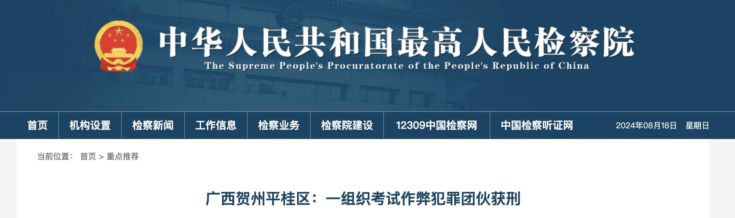 中國(guó)青年報(bào)注意到,就在8月9日,最高人民檢察院官網(wǎng)也公開(kāi)了一起“組織作弊案”。
