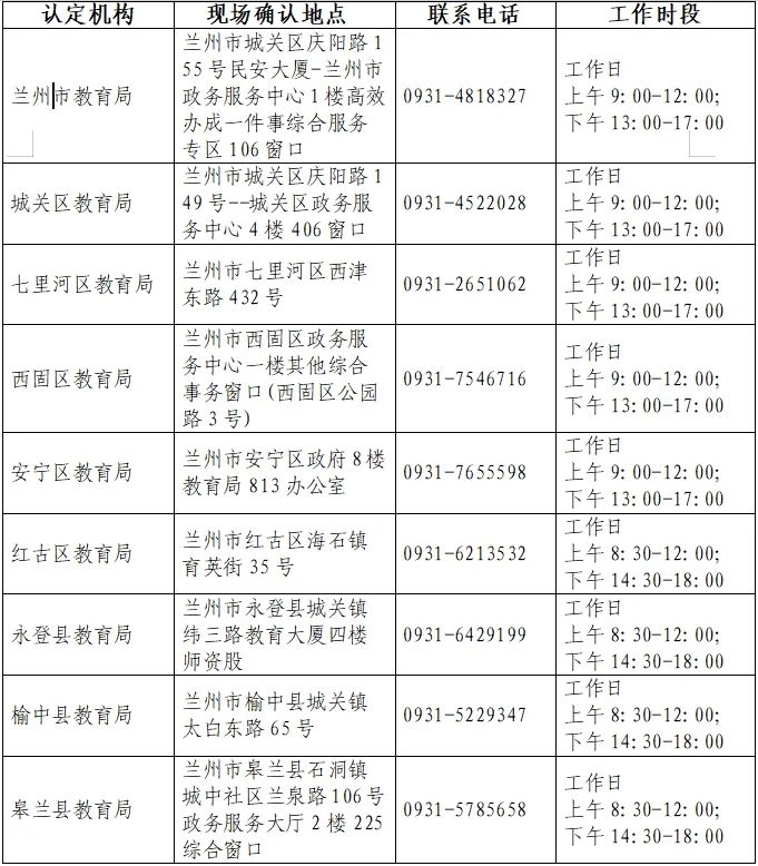 2.蘭州市各認(rèn)定機(jī)構(gòu)現(xiàn)場(chǎng)確認(rèn)地點(diǎn)及聯(lián)系方式