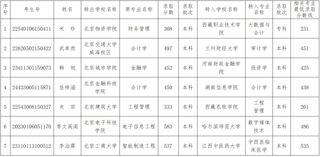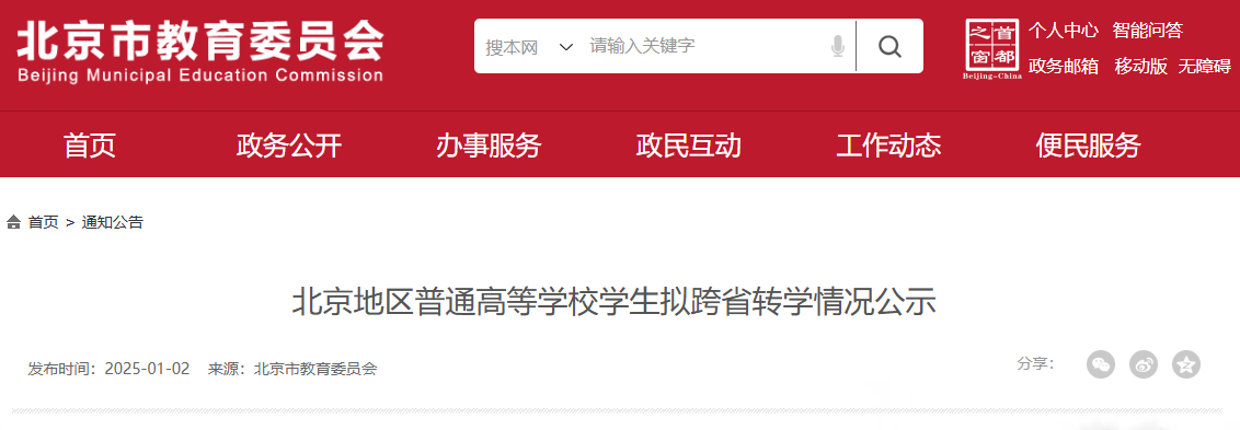 根據(jù)《北京市教育委員會關(guān)于做好普通高等學(xué)校學(xué)生轉(zhuǎn)學(xué)工作的意見》(京教學(xué)〔2017〕10號)關(guān)于轉(zhuǎn)學(xué)的規(guī)定,北京市教育委員會對高校報送的學(xué)生跨省轉(zhuǎn)學(xué)材料進(jìn)行了初審、復(fù)核,現(xiàn)將米珍等7名學(xué)生擬轉(zhuǎn)學(xué)情況予以公示。公示期自2025年1月2日起至1月8日結(jié)束,共5個工作日。公示期內(nèi),如對擬轉(zhuǎn)學(xué)學(xué)生情況有異議的,可以書面形式提出,所反映情況要真實、具體、客觀。以單位名義提出異議的,須在材料上加蓋本單位公章,并注明聯(lián)系人、通訊地址和聯(lián)系電話;個人提出的異議,須在材料上簽署本人真實姓名,并寫明本人工作單位、單位通訊地址(或家庭住址)和聯(lián)系電話。不符合上述要求的材料,市教委將不予受理。