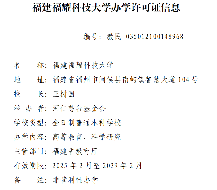 附件:福建福耀科技大學辦學許可證信息