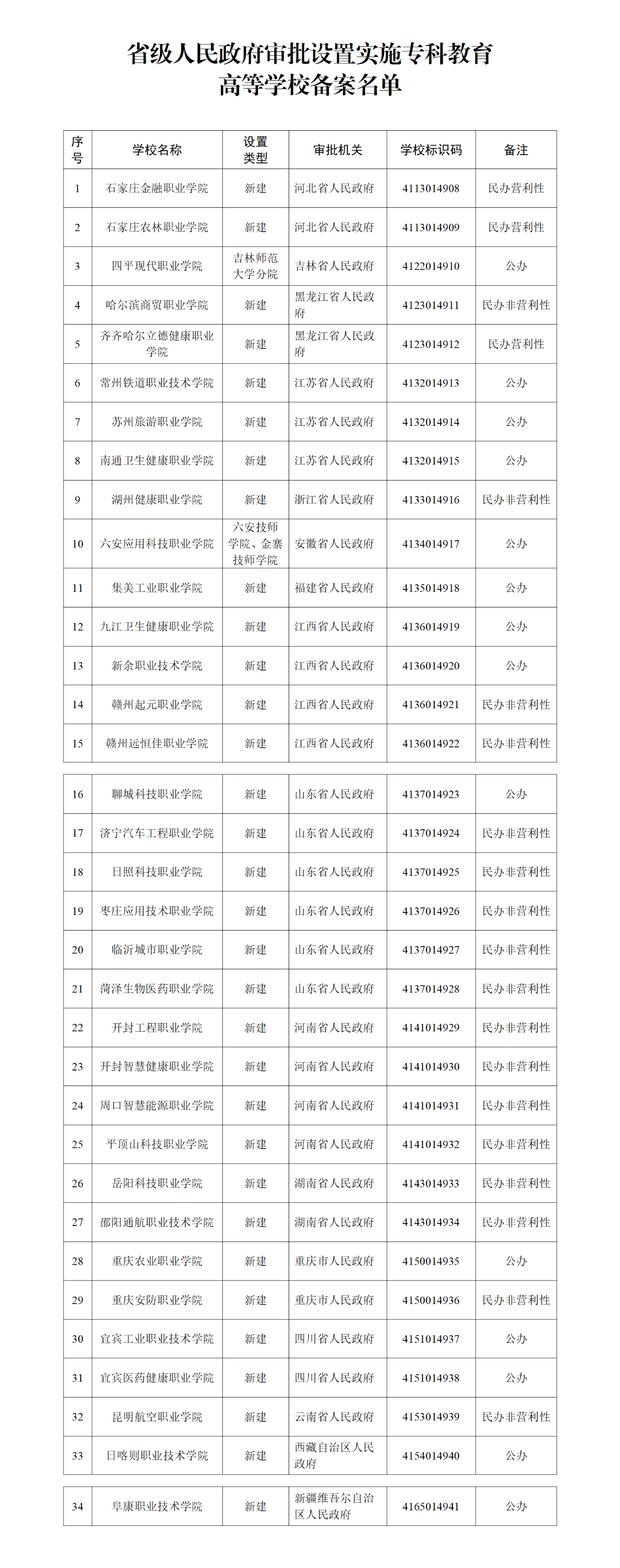 根據(jù)《中華人民共和國高等教育法》《普通高等學(xué)校設(shè)置暫行條例》等有關(guān)法律法規(guī)和政策文件的規(guī)定,現(xiàn)將省級(jí)人民政府審批設(shè)置的??茖哟胃叩葘W(xué)校備案名單予以公布。