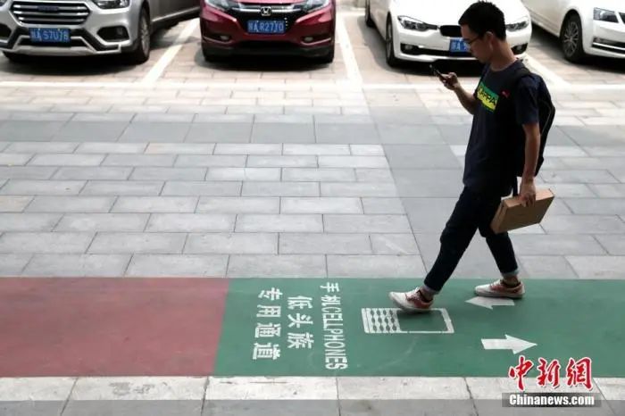 資料圖:西安街頭出現(xiàn)一條專為“低頭族”設(shè)計(jì)的通道。中新社記者 張遠(yuǎn) 攝