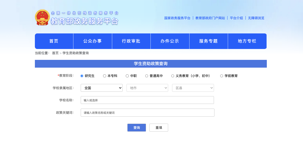 學(xué)生資助政策查詢服務(wù)頁面