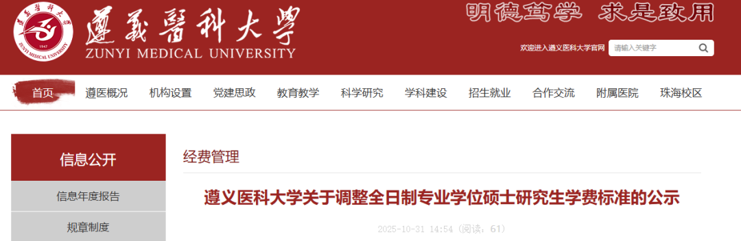 10月31日,遵義醫(yī)科大學(xué)發(fā)布《關(guān)于調(diào)整全日制專業(yè)學(xué)位碩士研究生學(xué)費(fèi)標(biāo)準(zhǔn)的公示》,根據(jù)省教育廳2025年3月下發(fā)的《省教育廳關(guān)于進(jìn)一步完善我省全日制專業(yè)學(xué)位碩士研究生學(xué)科分類學(xué)費(fèi)標(biāo)準(zhǔn)及有關(guān)事宜的通知》有關(guān)精神,學(xué)校經(jīng)研究決定,擬在不超過文件規(guī)定的學(xué)科分類學(xué)費(fèi)標(biāo)準(zhǔn)內(nèi)調(diào)整現(xiàn)有全日制專業(yè)學(xué)位碩士研究生有關(guān)專業(yè)學(xué)費(fèi)標(biāo)準(zhǔn)。