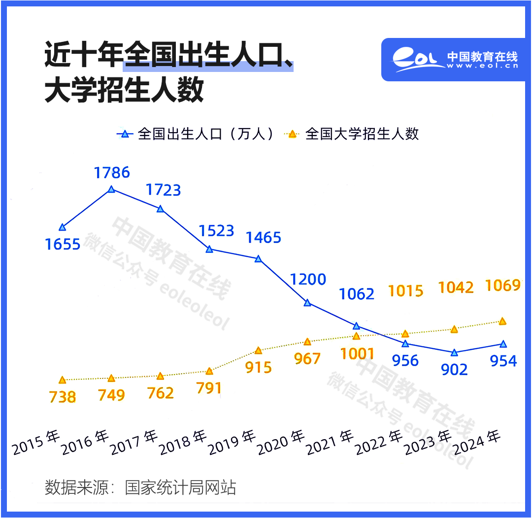 教育部2024年全國教育事業(yè)發(fā)展統(tǒng)計公報顯示,當(dāng)前我國各級各類學(xué)歷教育在校生達(dá)2.86億人,其中高等教育在學(xué)總規(guī)模已突破4000萬,2024年全國高校招生人數(shù)為1068.9萬人,創(chuàng)歷史新高。與之相對的是,2024年954萬的新生兒數(shù)量,即使18年后這些孩子全部健康成長,一個不流失,一個不分流,全去上大學(xué),也不夠大學(xué)招的。實際上,從2021年起,高校招生規(guī)模已突破1000萬,而2021年之后,新出生人口則一直在1000萬以下。