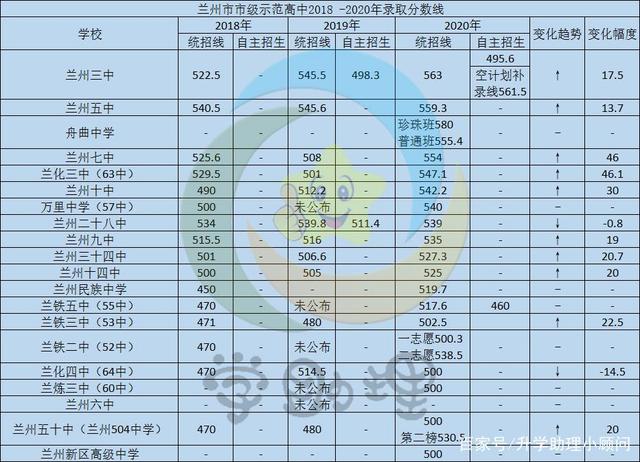 一診成績(jī)一出來(lái),家長(zhǎng)急的鬢角白。不論是考了多少分,都在焦慮地交流孩子的分?jǐn)?shù)能報(bào)哪個(gè)學(xué)校。尤其是今年中考新模式實(shí)行,跟往年相比又完全沒(méi)有參照系,著實(shí)急煞了相當(dāng)一批家長(zhǎng)。小編搜集整理了蘭州市近三年絕大多數(shù)普通高中的中考錄取分?jǐn)?shù)線(部分高中未公布),給大家分析一下各主要普高的錄取分?jǐn)?shù)線走勢(shì)。近三年來(lái),蘭州市城市四區(qū)中考市級(jí)示范性高中最低控制分?jǐn)?shù)線一直呈上升趨勢(shì),這里釋放了兩個(gè)信號(hào):一是中考的整體難度有所降低;二是普高的錄取人數(shù)比例有所下降。