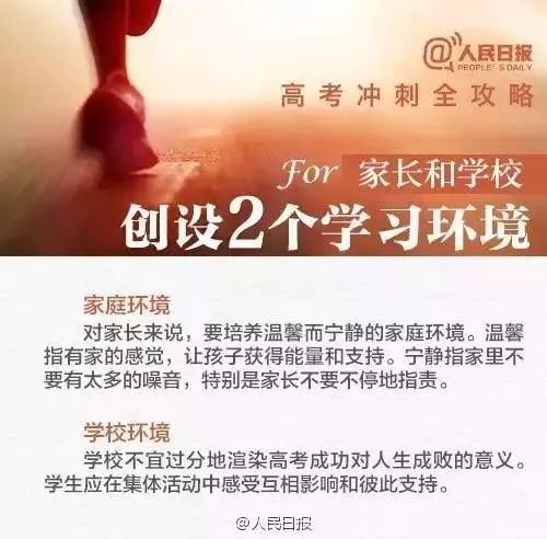 家長(zhǎng)要調(diào)整好自己的心態(tài):平常心、平靜心、理解心、愛撫心、激勵(lì)心、信任心;高考快樂,快樂高考;尊重孩子的人格、尊重孩子的復(fù)習(xí)方式、尊重孩子的應(yīng)對(duì)策略,只要學(xué)生是對(duì)的就可以。