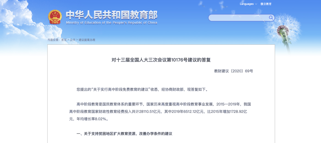 近日,針對(duì)人大代表提出的“關(guān)于全面落實(shí)高中階段免費(fèi)教育,不讓一個(gè)學(xué)生因家庭貧困而失學(xué)的建議”,教育部經(jīng)協(xié)商財(cái)政部,在其官網(wǎng)進(jìn)行答復(fù)。具體來看一看↓↓↓