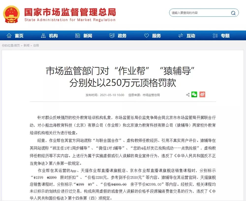 2021年5月10日,北京市市場監(jiān)管局依法對作業(yè)幫和猿輔導兩家校外教育培訓機構(gòu),均處以警告和250萬元頂格罰款的行政處罰。