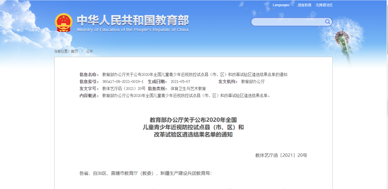 教育部辦公廳關(guān)于公布2020年全國(guó)兒童青少年近視防控試點(diǎn)縣(市、區(qū))和改革試驗(yàn)區(qū)遴選結(jié)果名單的通知