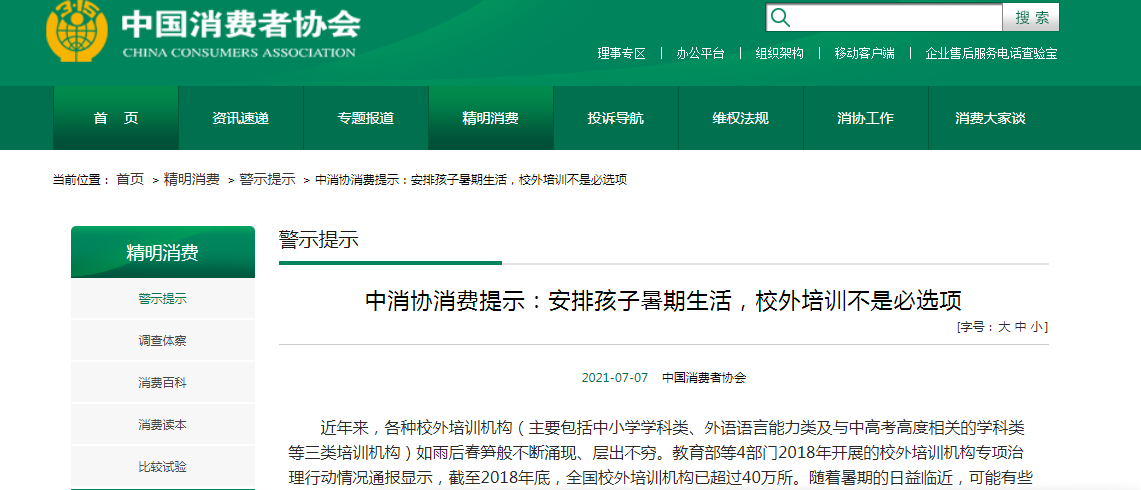 7月7日,中消協(xié)發(fā)布消費(fèi)提示:安排孩子暑期生活,校外培訓(xùn)不是必選項(xiàng)。