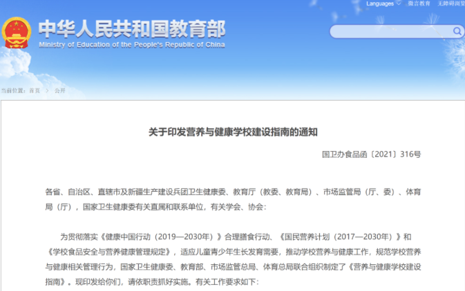 近日,教育部聯(lián)合國(guó)家衛(wèi)生健康委等四部門(mén)印發(fā)《營(yíng)養(yǎng)與健康學(xué)校建設(shè)指南》,對(duì)適應(yīng)兒童青少年生長(zhǎng)發(fā)育需要,推動(dòng)學(xué)校營(yíng)養(yǎng)與健康工作,規(guī)范學(xué)校營(yíng)養(yǎng)與健康相關(guān)管理行為作出要求。