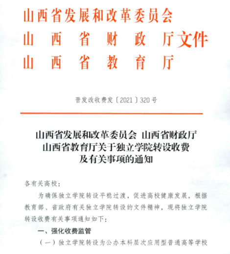近日,山西省發(fā)改委、省財(cái)政廳、省教育廳發(fā)布文件,確定獨(dú)立學(xué)院轉(zhuǎn)設(shè)之后的收費(fèi)事項(xiàng),保障獨(dú)立學(xué)院轉(zhuǎn)設(shè)平穩(wěn)過(guò)渡,促進(jìn)高校健康發(fā)展。