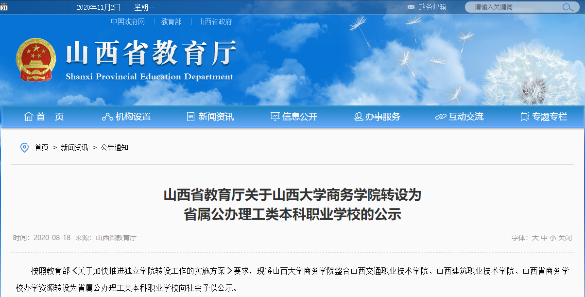 此前,山西省教育廳發(fā)布了《關(guān)于山西大學(xué)商務(wù)學(xué)院轉(zhuǎn)設(shè)為省屬公辦理科類本科職業(yè)學(xué)校的公示》。