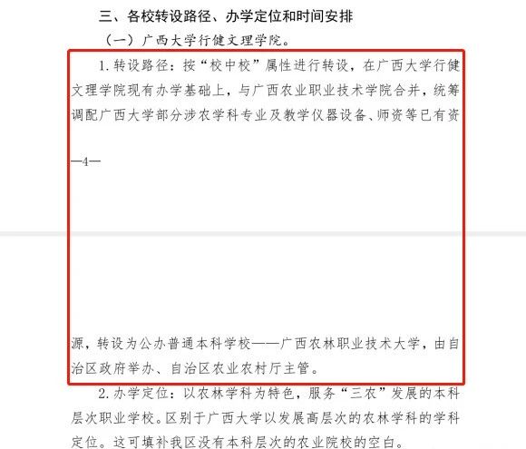 轉(zhuǎn)設(shè)路徑:按“校中校”屬性進行轉(zhuǎn)設(shè),在廣西大學(xué)行健文理文理現(xiàn)有辦學(xué)基礎(chǔ)之上,與廣西農(nóng)業(yè)職業(yè)技術(shù)學(xué)院合并,統(tǒng)籌調(diào)配廣西大學(xué)部分涉農(nóng)學(xué)科專業(yè)及教學(xué)儀器設(shè)備、師資等已有資源,轉(zhuǎn)設(shè)為公辦普通本科學(xué)?!獜V西農(nóng)林職業(yè)技術(shù)大學(xué),由自治區(qū)政府舉辦、自治區(qū)農(nóng)林農(nóng)村廳主管。