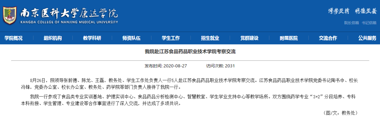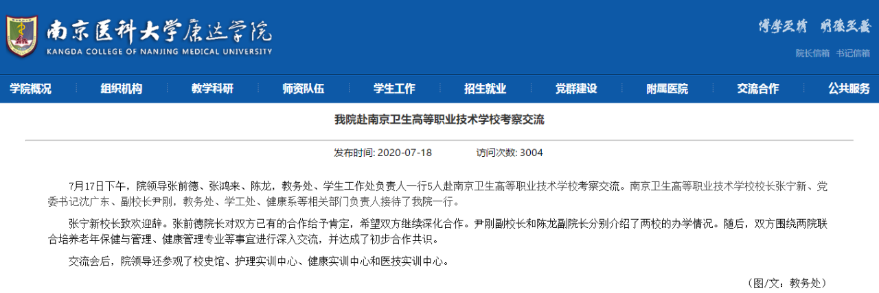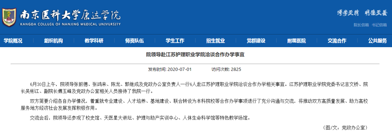 根據(jù)南京醫(yī)科大學(xué)康達學(xué)院官網(wǎng)公布信息,院校先后與江蘇護理職業(yè)學(xué)院、南京衛(wèi)生高等職業(yè)技術(shù)學(xué)校、江蘇食品藥品職業(yè)技術(shù)學(xué)院就合作辦學(xué)事項進行交涉。