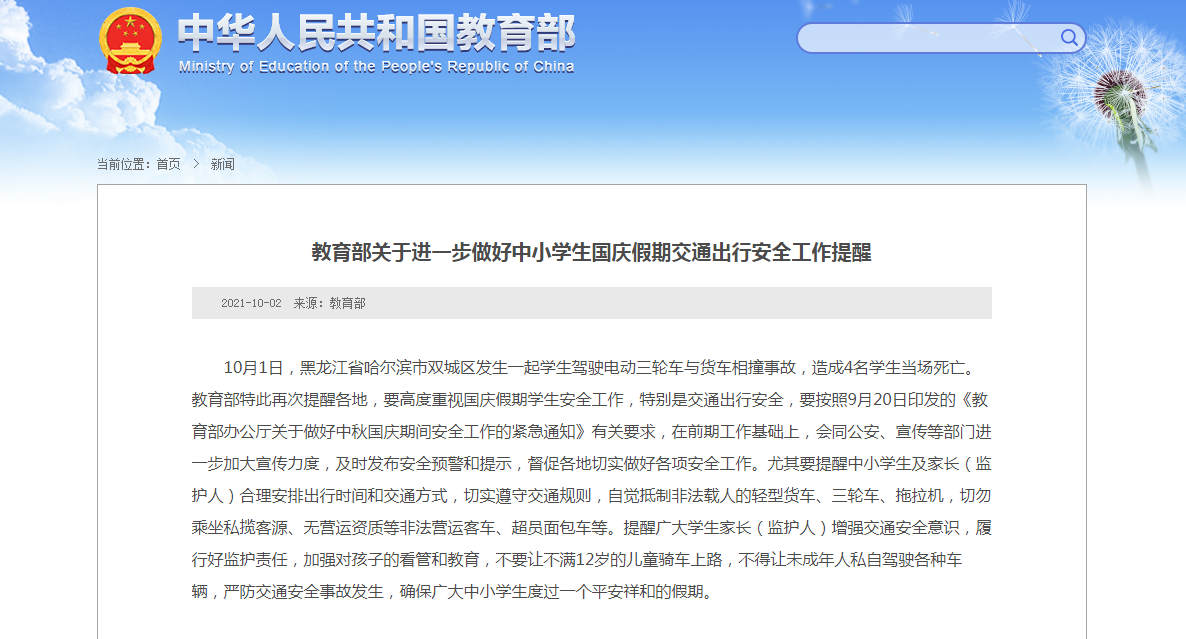 10月1日,黑龍江省哈爾濱市雙城區(qū)發(fā)生一起學(xué)生駕駛電動(dòng)三輪車與貨車相撞事故,造成4名學(xué)生當(dāng)場(chǎng)死亡。教育部特此再次提醒各地,要高度重視國(guó)慶假期學(xué)生安全工作,特別是交通出行安全,要按照9月20日印發(fā)的《教育部辦公廳關(guān)于做好中秋國(guó)慶期間安全工作的緊急通知》有關(guān)要求,在前期工作基礎(chǔ)上,會(huì)同公安、宣傳等部門進(jìn)一步加大宣傳力度,及時(shí)發(fā)布安全預(yù)警和提示,督促各地切實(shí)做好各項(xiàng)安全工作。