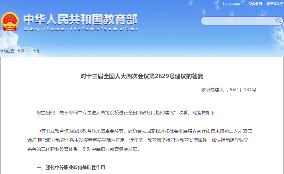 答復中提到:強化中等職業(yè)教育基礎性作用;暢通中職畢業(yè)生學歷提升通道。