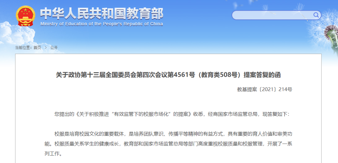 近日,教育部官網(wǎng)公布了《關(guān)于政協(xié)第十三屆全國委員會第四次會議第4561號(教育類508號)提案答復(fù)的函》,對《關(guān)于積極推進(jìn)“有效監(jiān)管下的校服市場化”的提案》進(jìn)行了答復(fù)。