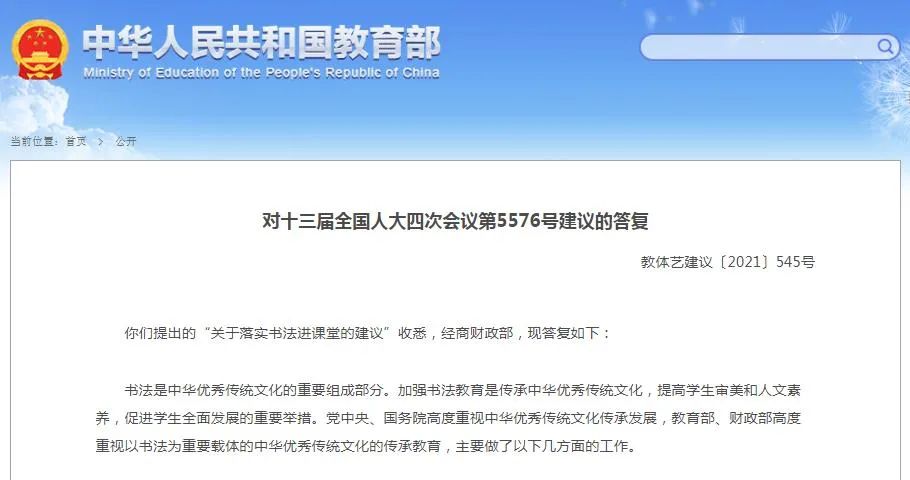 你們提出的“關于落實書法進課堂的建議”收悉,經(jīng)商財政部,現(xiàn)答復如下: