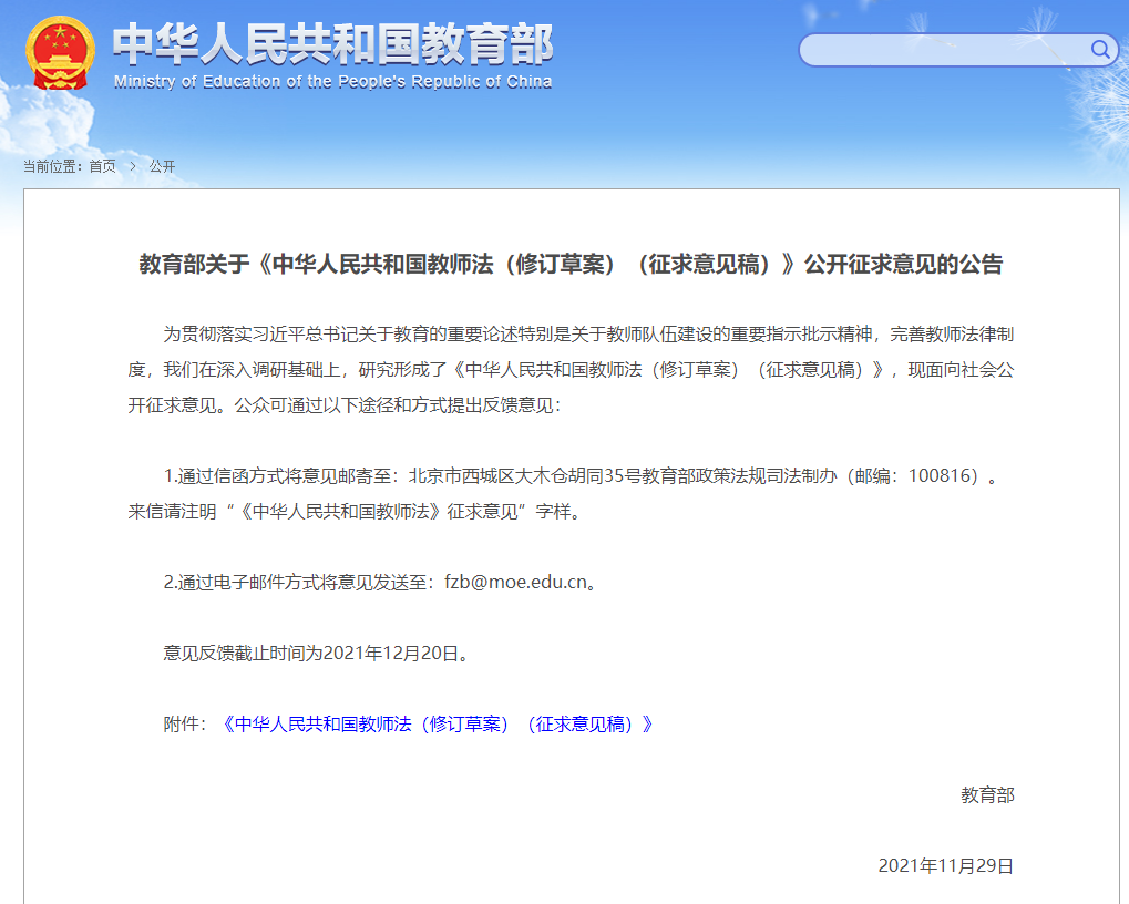 11月29日,教育部發(fā)布公告,就《中華人民共和國教師法(修訂草案)(征求意見稿)》面向社會(huì)公開征求意見。其中就有提到教師資格應(yīng)當(dāng)具備的相應(yīng)學(xué)歷學(xué)位。