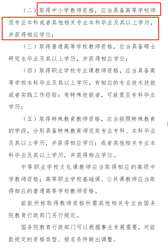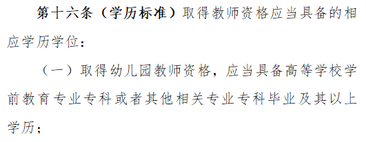第三章資格和準(zhǔn)入,第十六條(學(xué)歷標(biāo)準(zhǔn))有提到取得中小學(xué)教師資格,應(yīng)當(dāng)具備高等學(xué)校師范專業(yè)本科或者其他相關(guān)專業(yè)本科畢業(yè)及其以上學(xué)歷,并獲得相應(yīng)學(xué)位。