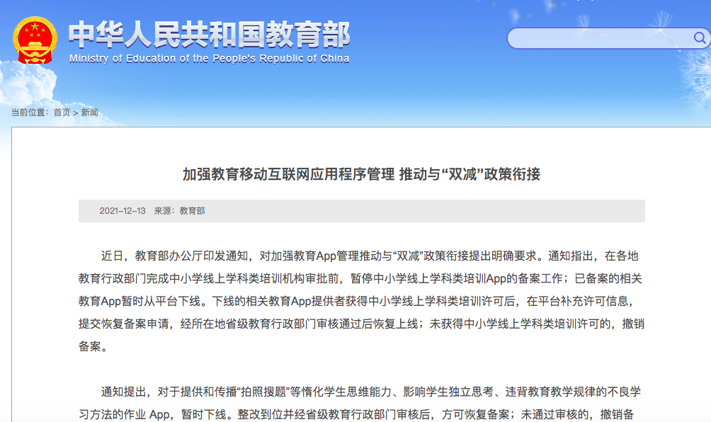 12月13日,教育部辦公廳印發(fā)通知,對(duì)加強(qiáng)教育App管理推動(dòng)與“雙減”政策銜接提出明確要求。通知提出,