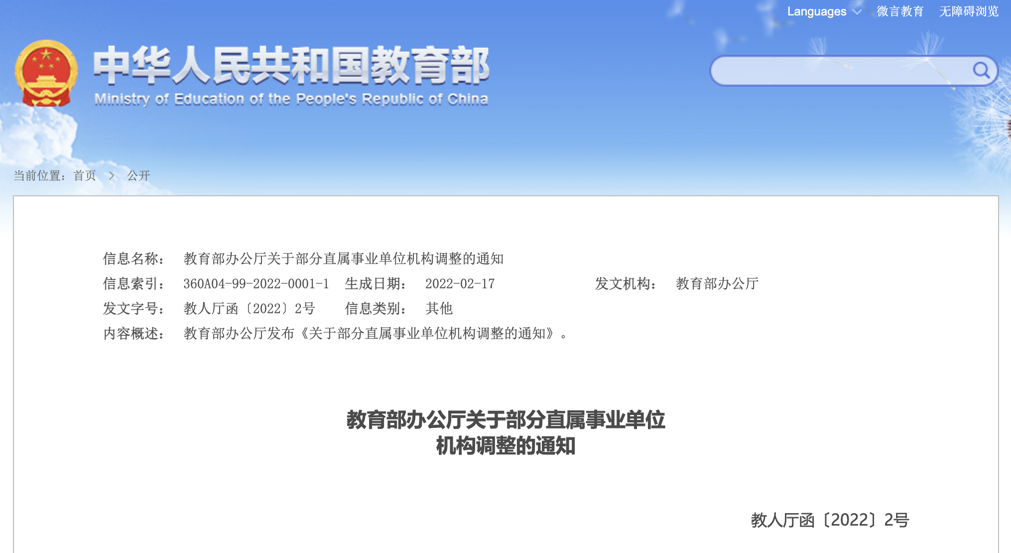 近日,教育部辦公廳發(fā)布《關(guān)于部分直屬事業(yè)單位機構(gòu)調(diào)整的通知》。經(jīng)中央編委批準(zhǔn),按照深化事業(yè)單位改革的要求,教育部部分直屬事業(yè)單位進行了調(diào)整,涉及中國教育科學(xué)研究院和教育部教育發(fā)展研究中心、教育部考試中心、教育部高等教育教學(xué)評估中心等,一起來看詳情——