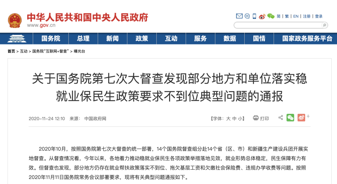 中國政府網(wǎng)11月24日發(fā)布《關(guān)于國務(wù)院第七次大督查發(fā)現(xiàn)部分地方和單位落實(shí)穩(wěn)就業(yè)保民生政策要求不到位典型問題的通報(bào)》,通報(bào)中提到,督查發(fā)現(xiàn),部分地方仍存在就業(yè)幫扶政策落實(shí)不到位、拖欠基層工資和欠繳社會(huì)保險(xiǎn)費(fèi)、違規(guī)辦學(xué)收費(fèi)等問題。
