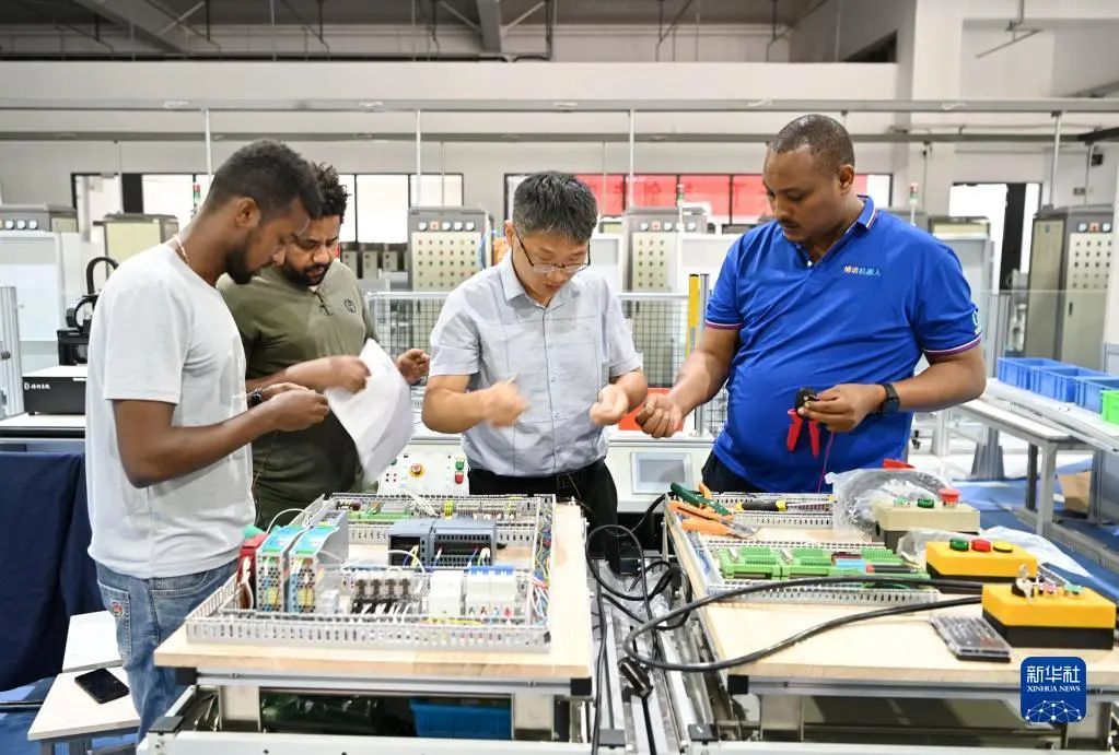 在天津職業(yè)技術師范大學,老師帶領韓士蘭(右一)和其他留學生進行實訓操作(2022年7月29日攝)。今年38歲的韓士蘭來自埃塞俄比亞,3年前,他來到天津,在天津職業(yè)技術師范大學攻讀教育學博士。新華社記者 李然 攝