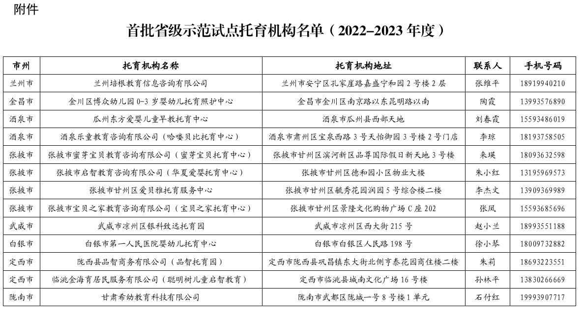 為深入貫徹落實國家和省上關(guān)于促進托育服務(wù)健康發(fā)展的決策部署,充分發(fā)揮示范性托育機構(gòu)的輻射帶動作用,推動全省3歲以下嬰幼兒照護服務(wù)工作專業(yè)化、規(guī)范化發(fā)展,根據(jù)《關(guān)于創(chuàng)建省級示范試點托育機構(gòu)的通知》(甘衛(wèi)家庭函〔2021〕210?號)要求,經(jīng)托育機構(gòu)自評申報、市縣主管部門逐級審核推薦、委托第三方現(xiàn)場審核、省衛(wèi)生健康委審定并公示,決定命名蘭州培根教育信息咨詢有限公司等13所托育機構(gòu)為甘肅省首批省級示范試點托育機構(gòu)并授牌,示范周期為2022-2023年度。