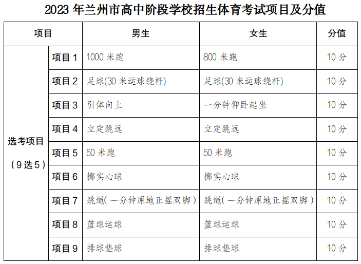 根據(jù)上級教育行政部門有關要求,全省各市(州)2023年高中階段學校招生體育考試采取在規(guī)定項目內(nèi)自選的方式進行。蘭州市2023年體育考試項目在9項內(nèi)自選5項,選考項目和分值見下表,總分值定為50分,評分標準、考試時間與往年一致,以考生各項目實際得分之和計入中考總成績。